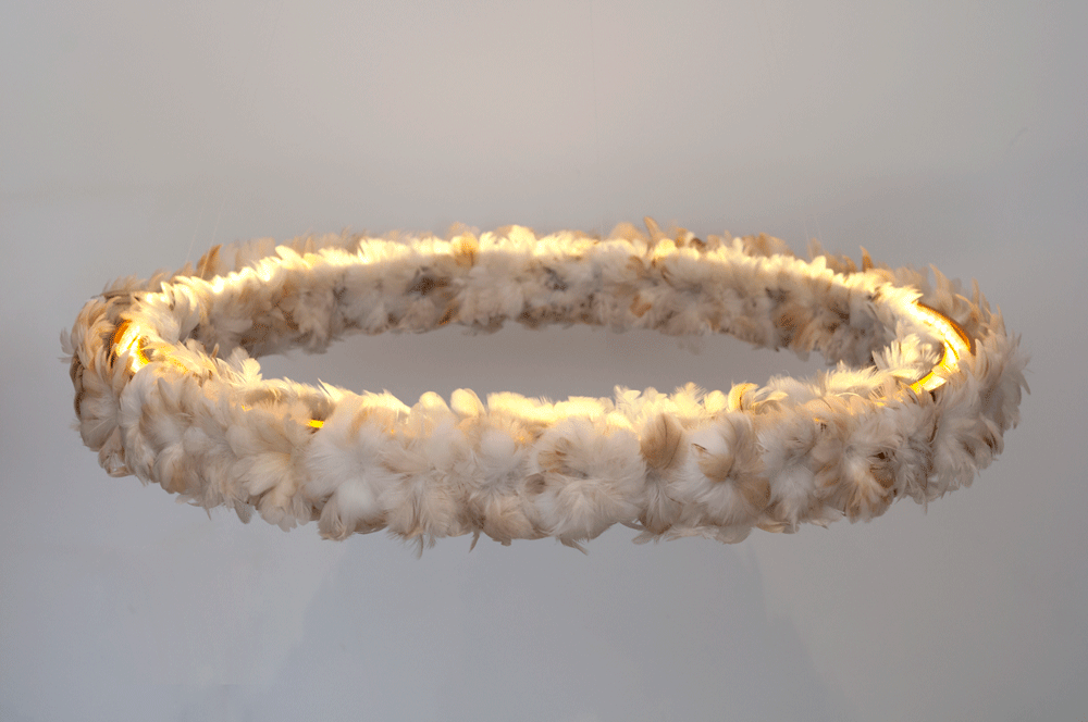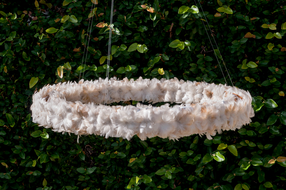 Madeira peroba maciça, penas de galinha e iluminação com fita de LED. Peça suspensa por cabos de aço.