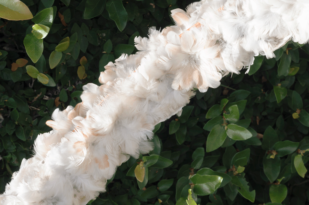 As flores criadas a partir de penas de galinha são feitas pela querida Txahamehé Pataxó, responsável também pela confecção das tiaras que tanto me encantaram no ritual.