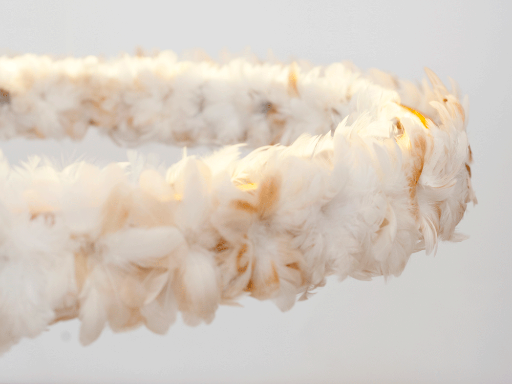 Assim nasceu o pendente Halo, buscando transmitir toda a magia daquele momento. Nele flores feitas com penas brancas circundam a estrutura esculpida em peroba rosa de demolição, que abriga uma fita de led, proporcionando uma luz indireta acolhedora e suave.